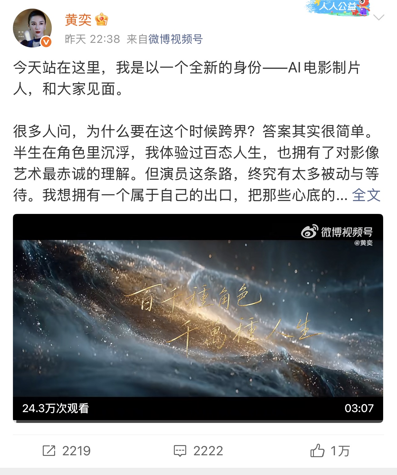 黄奕宣布跨界当AI电影制片人 图据黄奕微博